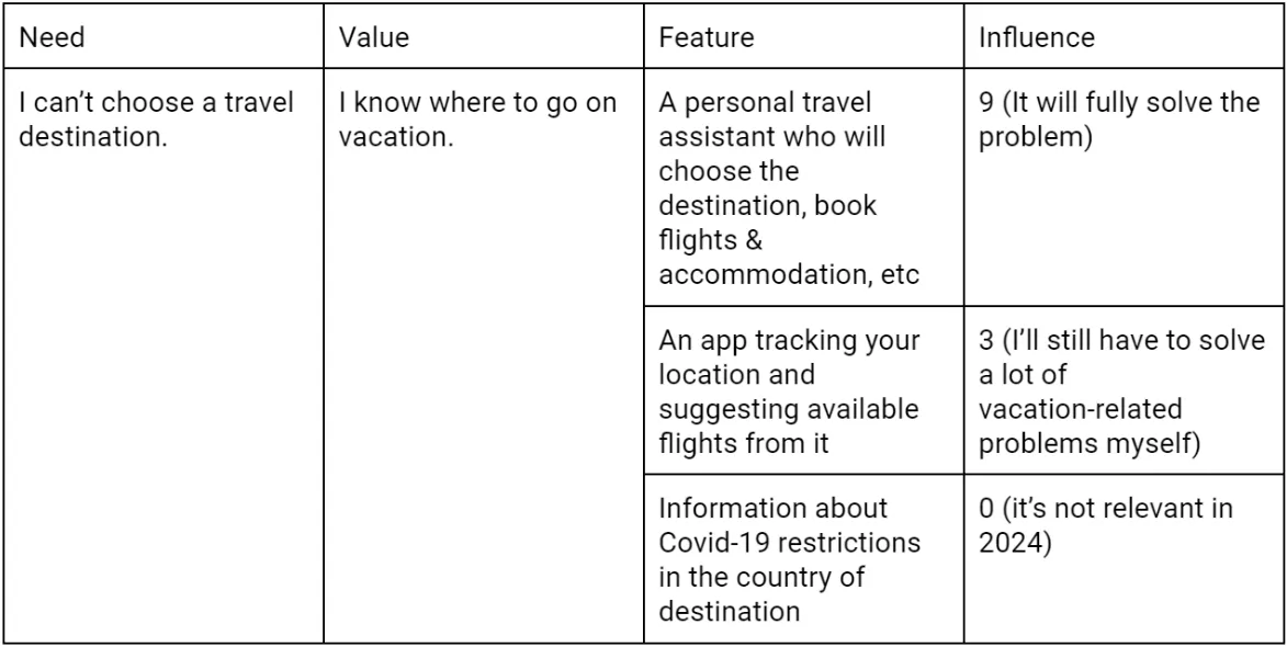 One more lifehack: you could fill in the framework for your competitors first. This way you’ll see which of the jobs-to-be-done do not have their respective features yet. It will create a niche for you to be the first or the best in the industry. If you deliver a value better than your competitors, it will make your product more popular among the customers.