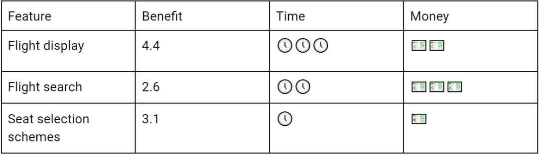 If we look at the table, we may conclude that the first feature with the maximum impact should be No. 1 in the priority list. However, this assumption would be wrong, because we also need to make sure that this need is the most relevant for our clients. Also, we have to create an approximate economic model of this feature’s implementation to ensure it’s cost-effective.