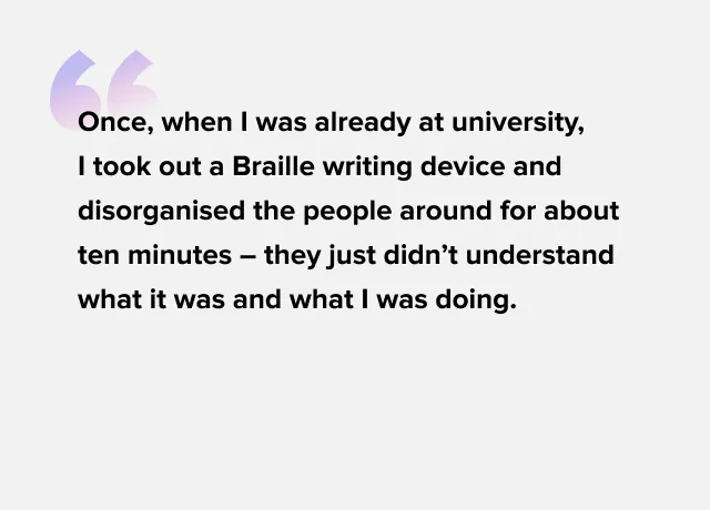 I went to one of the best schools for the blind in my country. I was lucky, there was a very professional team of teachers with many years of experience of teaching blind children. But the problem of all specialised institutions is that the children there are isolated from society and that society is isolated from them.