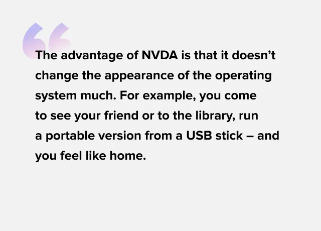 NVDA (Non-Visual Desktop Access) allows me to work with Windows. This is an open program made by two Australians. It’s free for users – the program exists on donations and, at the same time, it is more successful than many commercial ones.