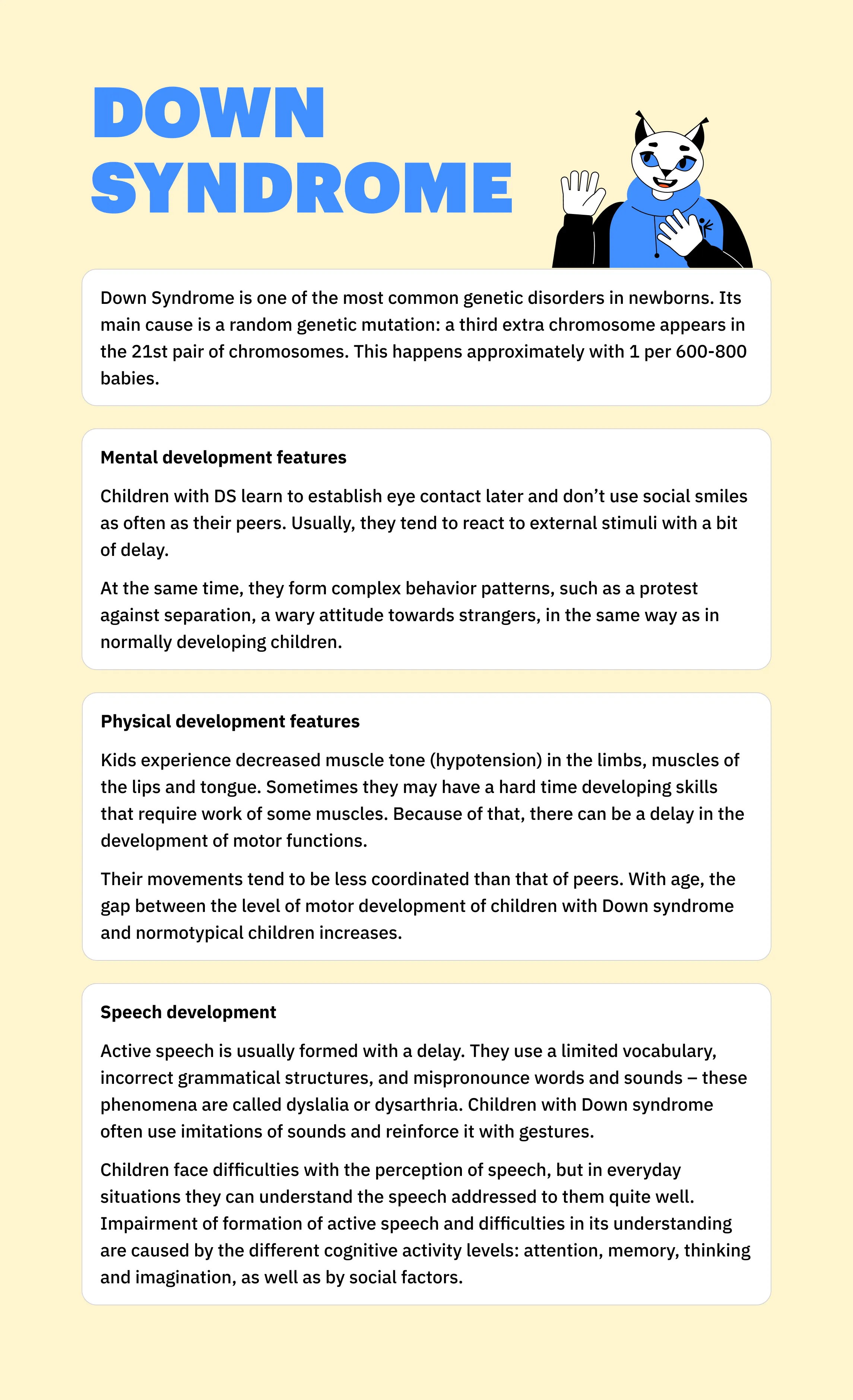 This is why we developed an inclusive design guide for general use. Maks Smirnov, a JetStyle’s art director, presented the guide at conferences and workshops for designers and received positive feedback. So we thought it’d be a great idea to share it with you. This guide is a comprehensive compilation of theoretical information about how people with Down Syndrome and Autistic Spectrum Disorder interact with the world and information. Knowing how they perceive information is crucial when we try to take all of these differences into account. In the second part of this guide, we outline a few recommendations for creating interfaces for people with Down Syndrome and Autistic Spectrum Disorder. Why don’t we start with some biological background?