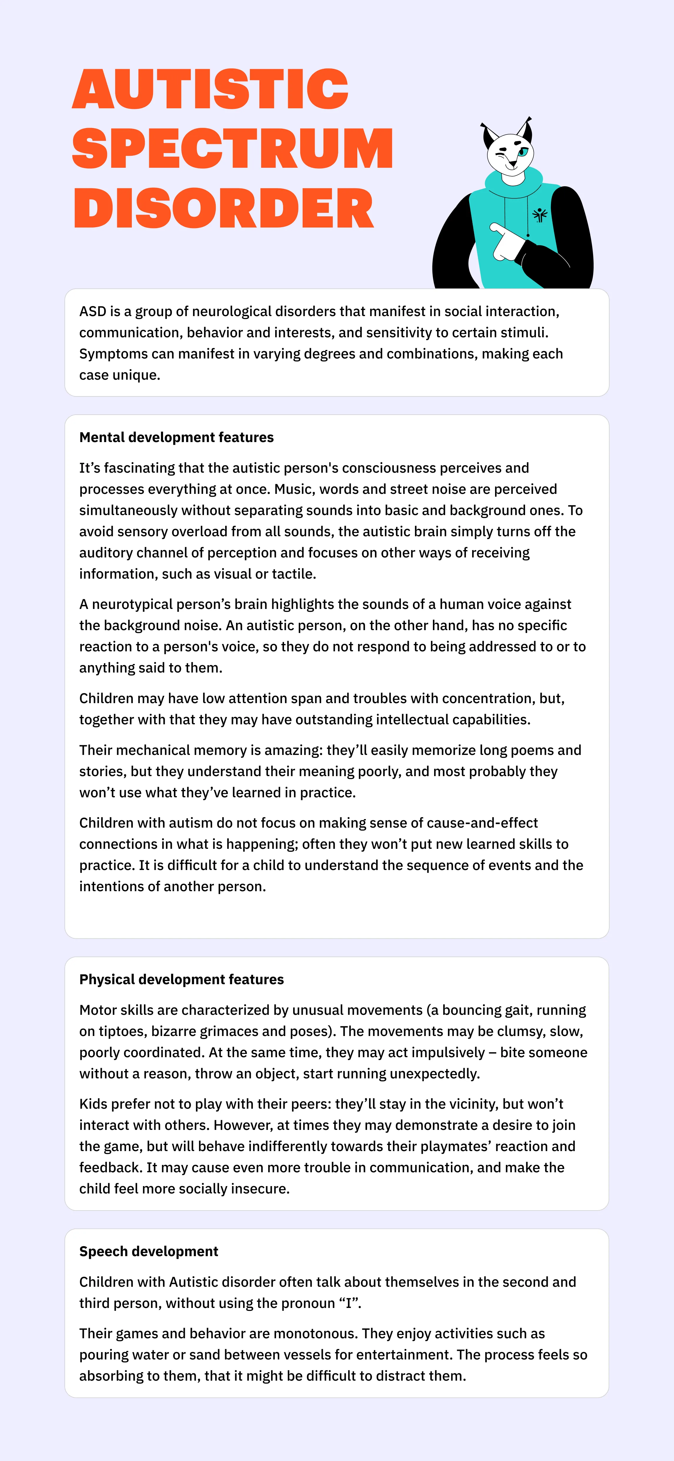 As we mentioned before, the mind of a person with autistic disorder perceives and processes everything at once - music, the words of the interlocutor and street noise, without dividing sounds into primary and background ones. Therefore, to avoid sensory overload from all sounds, the autistic brain simply shuts off the auditory channel of perception and focuses on other ways of receiving information - for example, visual or tactile. If you can, simply avoid audio information and stick to texts. Sudden sounds or picture changes can cause panic and irritation.